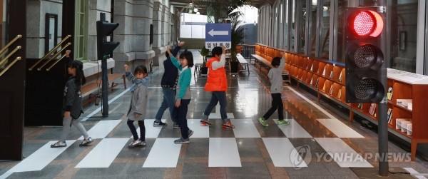 18일 오전 서울 중구 문화역서울284에서 열린 2018 공공디자인 기획전에서 어린이들이 유니버설 디자인으로 개선된 교통 안전 시설물을 체험하고 있다. 이번 행사는 오는 28일까지 열린다.