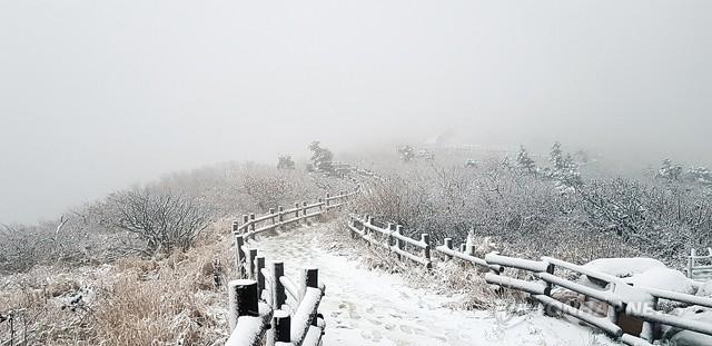 설악산에 올가을 첫눈이 내린 18일 중청대피소 주변에 눈이 쌓여 있다.