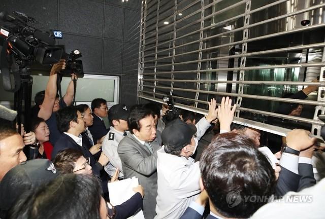 자유한국당 김성태 원내대표가 18일 오후 ‘청년일자리 탈취 고용세습 엄중수사 촉구’ 긴급 규탄대회를 위해 서울시청으로 진입하려 하고 있다.