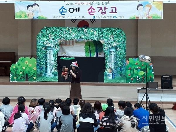 전라남도해남교육지원청(장성모교육장)은 지난 8일(월)부터 19일(금)까지 해남관내 초등학교 6개교의 학생 250명을 대상으로 학교폭력예방을 위한 인형극 ‘손에 손잡고’ 공연을 성황리에 마쳤다.