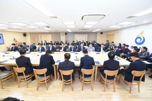 김상호 경기 하남시장은 18일 시청 상황실에서 실·과·소장 및 각 행정복지센터 부서장들이 참여한 가운데 시민불편사항 및 아이디어 정책제안을 실시했다. 이번 회의는 시민의 불편민원으로는 ▲신장2동 행정복지센터 확충 ▲공공시설 이용 불편 민원, 아이디어 정책으로는 ▲보안등 스마트 민원관리시스템 등에 대해 논의했다. 사진은 김 시장 및 참여자들이 회의하는 모습. (사진제공=하남시청)