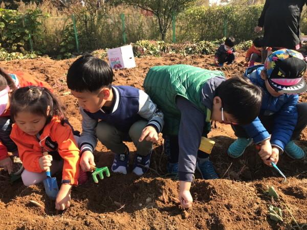 경기 수원시 권선구는 지난 17일 새마을지도자협의회 주관으로 어려운 이웃을 돕기 위한 ‘사랑의 고구마 캐기 행사’를 열었다. 사진은 행사에 참여한 어린이들이 고구마를 캐고 있는 모습.(사진제공=권선구청)