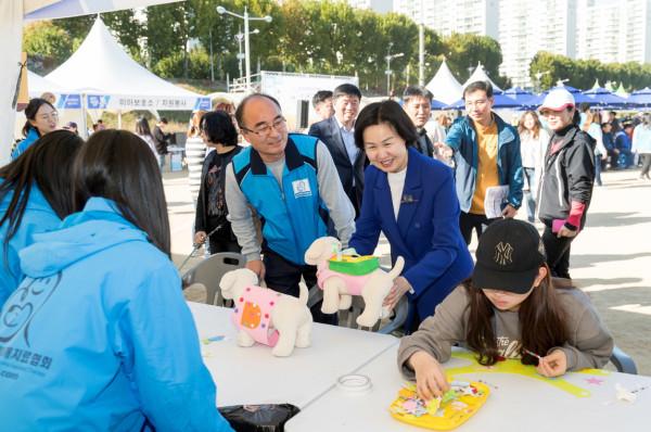 지난 20일 오후 양천구 안양천 신정교 해마루축구장에서 열린 ‘반려견과 함께하는 문화예술축제’에 참석한 김수영 양천구청장이 반려견 옷 만들기 체험 부스를 둘러보고 있다. (사진제공=양천구청)