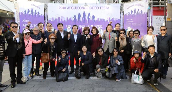 최근 서울 강남구 압구정로데오 거리에서 ‘2018 압구정로데오 페스타’가 개최됐다. 이번행사에는 김기수, 최겨울 등 유명 뷰티·패션 유튜브 크리에이터들 등이 참여했다. 사진은 정순균 구청장이 백옥수 디자이너의 한복 특별전 관람 후 시민들과 함께 기념촬영을 하고 있는 모습. (사진제공=강남구청)