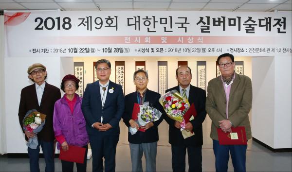인천 미추홀구는 22일 인천 수봉문화회관에서 ‘제9회 대한민국실버미술대전 시상식’을 개최했다. 대한민국실버미술대전은 전국 65세 이상 노인들을 대상으로 한 전국 규모의 미술실기 대회다. 사진은 김정식 구청장 및 수상자들이 기념촬영을 하는 모습. (사진제공=미추홀구청)