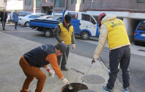 | ▲ 가을철 모기 발생을 막기 위해 ‘집중 방제작업’을 진행하고 있는 영등포구 관계자들의 모습. (사진제공=영등포구청) | ||