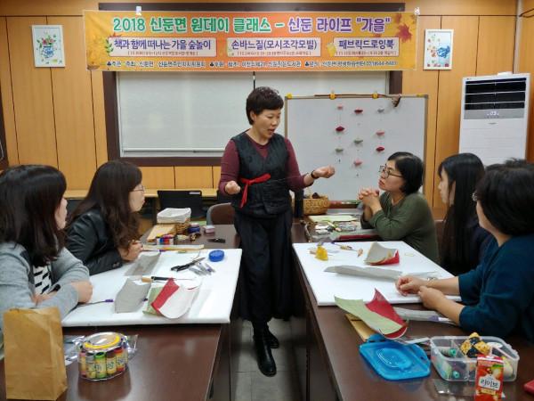 경기 이천시 신둔면 주민자치학습센터는 24일 신둔 라이프 ‘가을’ 원데이 프로그램으로 모시를 활용한 모빌 만들기로 집안을 멋지게 장식할 생활소품을 손바느질로 꾸며보는 프로그램을 운영했다. 사진은 강사가 모빌 만들기에 대해 설명하는 모습. (사진제공=이천시청)