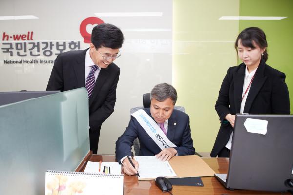 경기 용인시의회 이건한 의장이 24일 국민건강보험 용인동부지사에서 일일 명예 지사장에 위촉된 가운데 결재 서류에 서명을 하고 있다. (사진제공=용인시의회)