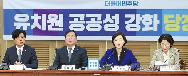 유은혜 사회부총리 겸 교육부 장관(오른쪽 두번째)이 25일 오전 국회 의원회관에서 열린 유치원 공공성 강화 당정협의를 마치고 결과를 발표하고 있다.