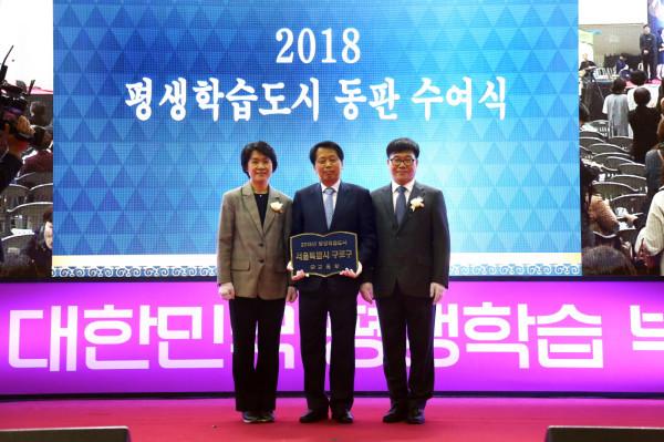 25일 서울 구로구가 부산 bexco(벡스코)에서 열린 ‘제6회 대한민국 평생학습 박람회’에서 ‘2018 평생학습도시 동판·증서’를 수여받았다. 사진은 동판을 수여하고 기념촬영을 하고 있는 이성 구청장(가운데)의 모습. (사진제공=구로구청)