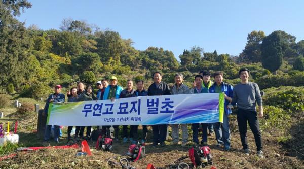 경기 남양주시 다산2동 주민자치위원회는 25일 다산2동 소재 공동묘지에서 명절에도 돌볼 후손이 없어 방치된 무연고 분묘에 대한 벌초를 진행했다. 사진은 벌초에 참여한 관계자들이 기념촬영을 하는 모습. (사진제공=남양주시청)