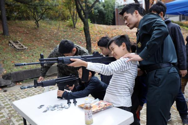 지난 27일 강남구 개포디지털혁신파크 울림마당에서 4차 산업 관련 진로탐색을 중심으로 한 ‘꿈에 날개를 달아 DREAM-2018 강남구 청소년 진로박람회’가 개최됐다. 사진은 박람회에 참가한 학생들이 사격을 체험해보고 있는 모습. (사진제공=강남구청)