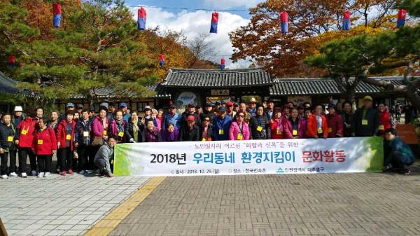 인천 미추홀구는 29일 노인일자리 참여 노인들을 위한 문화탐방 활동을 실시했다. 한국민속촌에서 진행된 문화탐방 활동에는 ‘우리동네 환경지킴이’ 사업에 참여하고 있는 노인 290여명이 참가했다. 사진은 참여자들이 기념촬영을 하는 모습. (사진제공=미추홀구청)