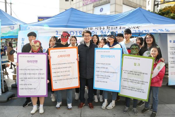 성동구가 지난 27일 왕십리광장 일원에서 청소년과 지역주민이 함께 어우러지는 청소년 축제 ‘난장판’을 개최했다. 사진은 난장판 행사에 참석한 정원오 구청장(가운데)이 모의 청소년 구청장 투표소에서 청소년들과 기념촬영을 하는 모습. (사진제공=성동구청)