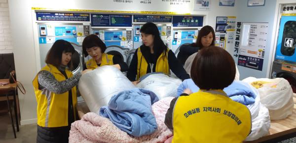 경기 수원시 권선구 호매실동지역사회보장협의체는 30일 워시앤조이 호매실점의 협조로 취약계층 5가구의 이불빨래를 진행했다. 사진은 협의체 관계자들이 이불빨래를 하고 있는 모습. (사진제공=권선구청)