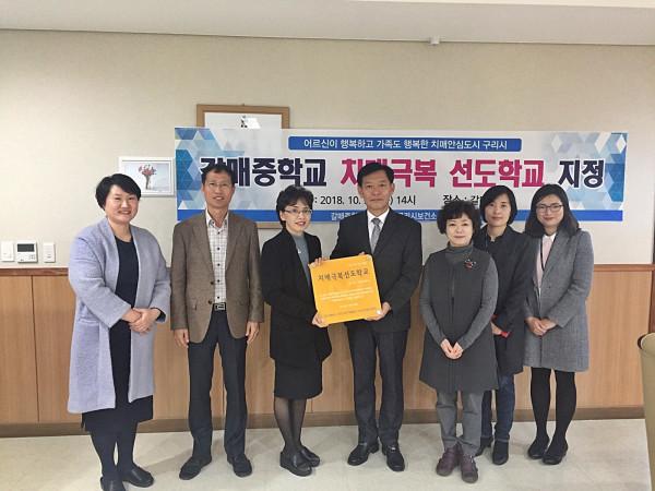 경기 구리시의 치매안심센터는 30일 지역내 갈매중학교를 ‘치매 극복 선도 학교’로 지정하는 현판식을 개최했다. 사진은 시 및 학교 관계자들이 치매 극복 선도 학교 지정 현판 설치에 앞서 기념촬영을 하는 모습. (사진제공=구리시청)
