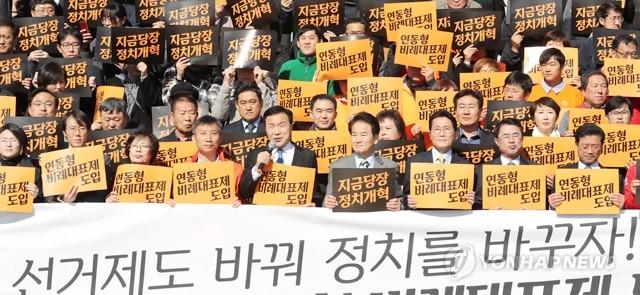 바른미래당 손학규 대표(앞줄 왼쪽 다섯번째)가 31일 오전 국회 본관 앞 계단에서 열린 ‘선거제도 바꿔 정치를 바꾸자! 연동형 비례대표제 도입하자!’ 공동 기자회견에서 발언하고 있다. 이번 공동 기자회견은 바른미래당, 민주평화당, 정의당, 민중당, 노동당, 녹색당, 우리미래, 정치개혁 공동행동이 함께했다.