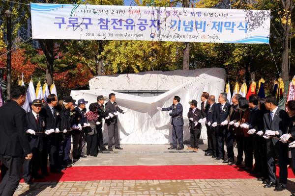 서울남부보훈지청이 최근 서울 구로구 거리공원에서 구로구 최초로 참전유공자 기념비 제막식을 거행했다. 기념비는 6.5m·높이 2.7m 규모로 6.25참전유공자와 월남전참전유공자 4300여명의 성명이 각인돼 있다. 사진은 제막식 진행 모습. (사진제공=서울남부보훈지청)