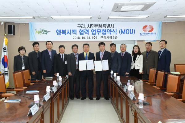 경기 구리시는 31일 시청에서 한국전력공사 구리지사와 ‘구리, 시민 행복특별시 행복 시책 추진을 위한 업무협약’을 체결했다. 사진은 업무협약식에 참석한 안승남 시장 등 관계자들이 기념촬영을 하는 모습. (사진제공=구리시청)