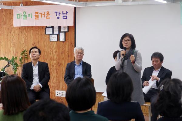 서울 강남구의회 이상애 의원이 최근 개포디지털혁신파크(강남구 개포동 소재)에서 열린 ‘강남구 마을공동체 포럼’에 패널로 참석, ‘마을공동체 활성화와 협치 과제’를 주제로 열띤 토론을 펼쳤다. 사진은 이 의원이 참석자들과 토론을 하고 있는 모습. (사진제공=강남구청)