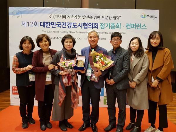 경기 오산시는 최근 대한민국 건강도시상 어워드의 활동적인 생활환경 조성사업 공동정책부문에서 ‘걸음아, 날 살려라! 오산시 걷기 프로젝트’로 ‘우수상’을 수상했다. 사진은 관계자들이 수상을 기념해 기념촬영하는 모습. (사진제공=오산시청)