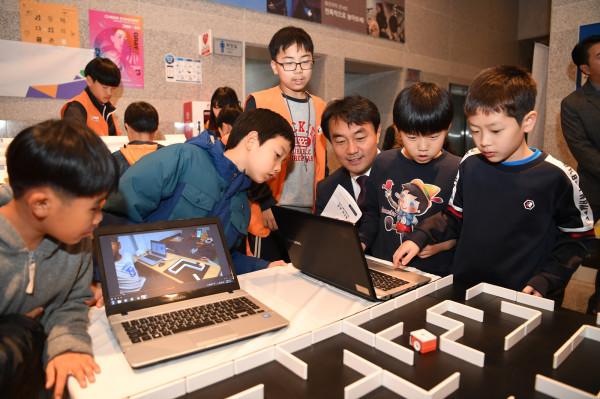 경기 하남시는 1일 하남문화예술회관 아랑홀에서 드림스타트 운영위원 및 아동과 가족 등 250여명이 참석한 가운데 ‘2018년 드림스타트 사업 성과보고회’를 개최했다. 사진은 행사에 참석한 김상호 시장이 아동들과 함께 체험활동을 하는 모습. (사진제공=하남시청)