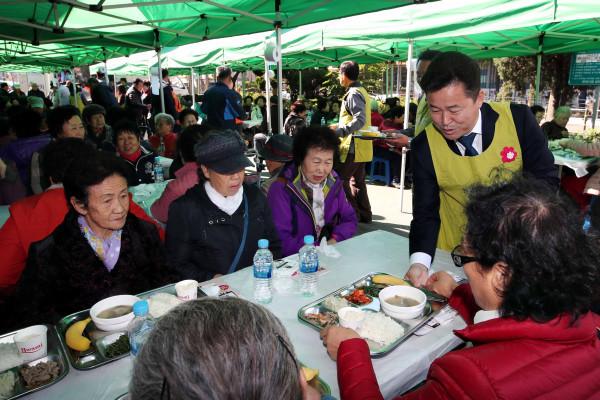 한국자유총연맹 인천 동구지회 송림6동 분회는 1일 송림동 원예농협 앞에서 지역노인 300여명이 참여한 가운데 ‘이웃사랑 효도잔치’를 개최했다. 사진은 행사에 참석한 허인환 구청장이 음식을 대접하고 있는 모습. (사진제공=인천 동구청)