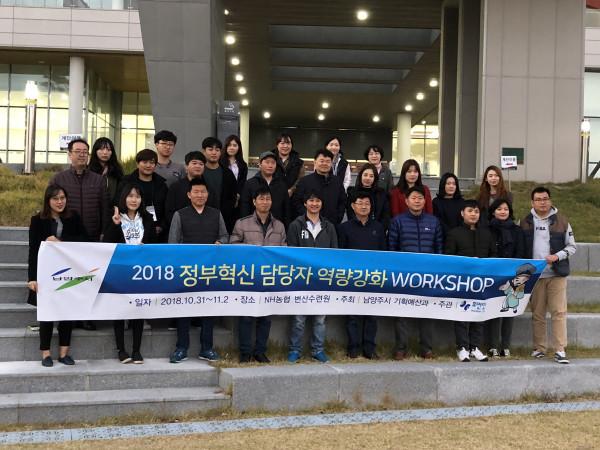 | ▲ 남양주시 관계자들이 ‘2018 정부혁신 담당자 역량강화 워크숍’에 참석한 후 기념촬영을 하는 모습. (사진제공=남양주시청) | ||