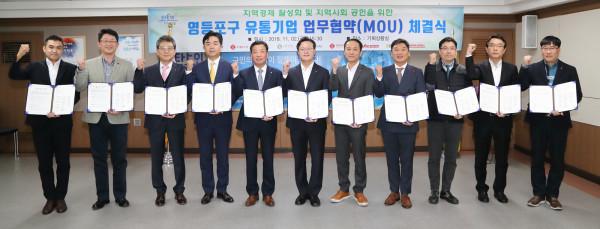 영등포구는 지난 2일 구청 기획상황실에서 지역내 유통기업들과 ‘지역경제 활성화와 지역사회 공헌을 위한 업무협약’을 체결했다. 사진은 업무협약식에 참석한 채현일 구청장과 유통기업 관계자들이 협약서를 들고 기념촬영을 하는 모습. (사진제공=영등포구청)