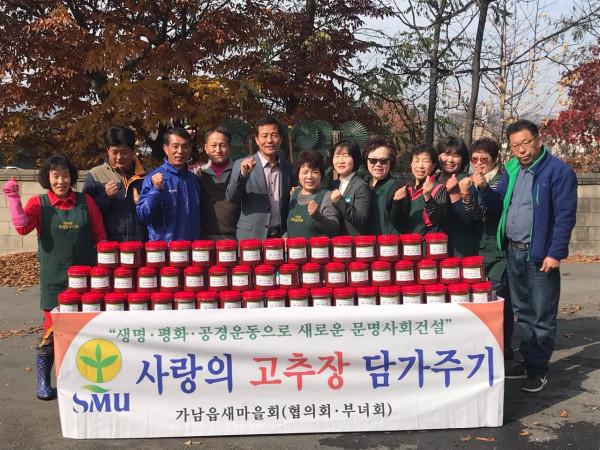 경기 여주시 가남읍 새마을회는 지역내 저소득 취약계층 78가구에 고추장을 전달하는 ‘사랑의 고추장 담가주기 사업’을 진행했다. 사진은 새마을회 회원들이 고추장 담기 행사 종료 후 기념촬영을 하는 모습. (사진제공=여주시청)
