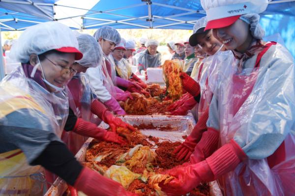 지난 3일 대한적십자사 서울시지사가 남부봉사관에서 삼정KPMG의 후원으로 동작구 및 관악구 취약계층 420가구에 전달할 김장김치 3360kg을 담갔다. 사진은 삼정KPMG 직원 및 적십자 봉사원들이 열심히 김치를 담그는 모습. (사진제공=대한적십자사 서울시지사)