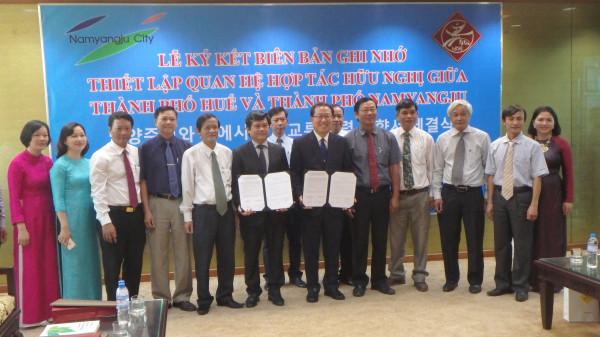 최근 경기 남양주시는 베트남 트어티엔후에성 후에시를 방문해 ‘우호교류 협력 의향서’를 체결했다. 사진은 조광한 시장을 비롯한 시 관계자를 비롯한 후예시 관계자 등이 협약서 체결 후 기념촬영을 하는 모습. (사진제공=남양주시청)
