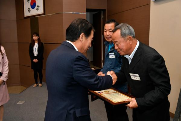 경기 포천시는 5일 시청 대회의실에서 ‘2018 포천 농업인의 날’을 맞이해 농·축산 발전 유공자들에 대한 표창 수여식을 진행했다. 사진은 박윤국 시장이 농·축산 발전 유공자들에게 표창장을 전달하고 있는 모습. (사진제공=포천시청)