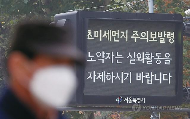 올가을 첫 초미세먼지 주의보가 발령된 6일 오후 서울 중구 서울시청 인근 전광판에 관련 안내 문구가 표시되고 있다.