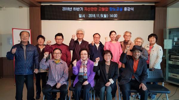경기 양평군보건소는 지난 5일 지역 고혈압·당뇨질환자 18명을 대상으로 9월부터 8주간 운영한 ‘자신만만 고혈압·당뇨건강교실’의 종강식을 진행했다. 사진은 종강식에 참석한 교육 관계자들이 기념촬영을 하는 모습. (사진제공=양평군청)