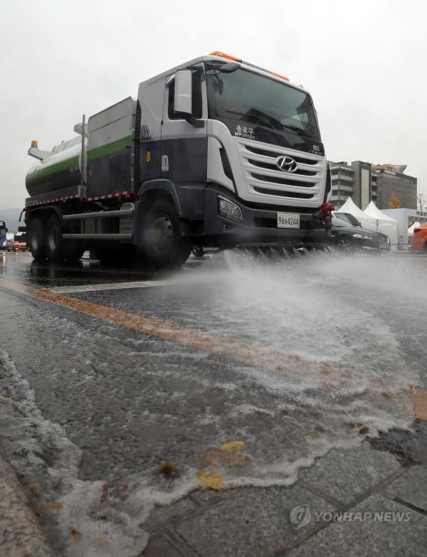 수도권 미세먼지 저감조치가 발령된 7일 오전 서울 종로구 광화문광장 일대에서 서울시가 청소차량을 동원해 미세먼지 저감 대책에 따른 도로 물청소를 하고 있다.