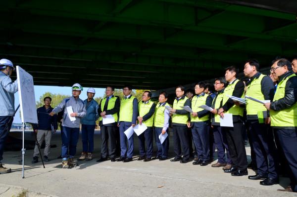 서울시의회 도시안전건설위원회는 지난 5일 서울시 안전총괄본부 소관 행정사무감사의 일환으로 도로 공동탐사 현장과 월드컵대교 건설공사 현장을 현장방문했다. 사진은 월드컵대교 현장에서 브리핑을 받고 있는 교통위 위원들의 모습. (사진제공=서울시의회)