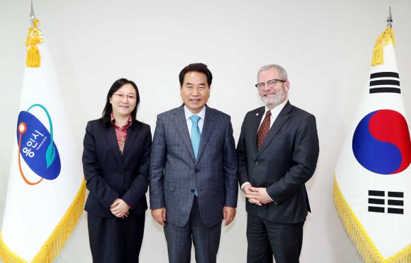 백군기 경기 용인시장은 6일 시장실에서 중국 산동성 위해시에 있는 베이징교통대학 위해 캠퍼스 관계자 6명을 만나, 한·중 교육 교류협력을 논의했다. 사진은 백 시장(가운데)이 베이징교통대 관계자들과 기념촬영을 하는 모습. (사진제공=용인시청)