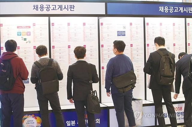 7일 오후 서울 송파구 잠실 롯데호텔에서 고용노동부, 코트라, 산업인력공단 등이 공동 주최한 ‘2018 일본 취업박람회’에서 구직자들이 채용게시판을 살펴보고 있다.