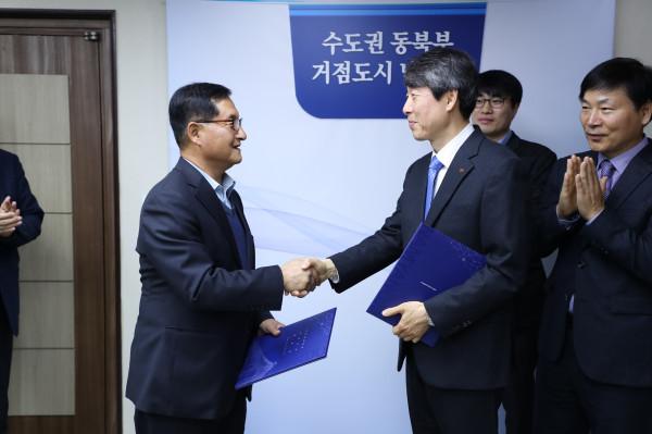 경기 남양주시는 7일 시청에서 한국전력공사 경기북부지역본부와 ‘스마트시티 구현 및 에너지 신산업 활성화’를 위한 업무협약을 체결했다. 사진은 시청 및 한전 관계자가 협약 체결 후 악수를 나누는 모습. (사진제공=남양주시청)