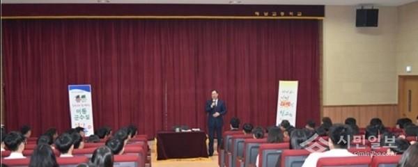 2부 사회자는 즉석에서‘해남고 행복한 등교 맞이’에 군수님도 동참할 수 있는지 질문에 명현관 군수는 내년에는 꼭 참가하겠다는 약속을 다짐 했다.