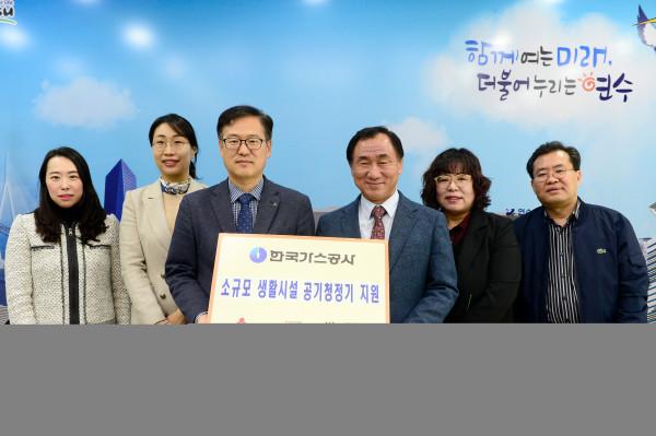 인천 연수구는 지난 9일 한국가스공사 인천기지본부로부터 지역내 지역아동센터·방과후교실 및 소규모 생활시설 등 23개 기관에 공기청정기 지원을 위한 지정기탁금 1587만원을 전달받았다. 사진은 고남석 구청장 및 한동근 본부장 등 관계자들이 기념촬영을 하는 모습. (사진제공=연수구청)