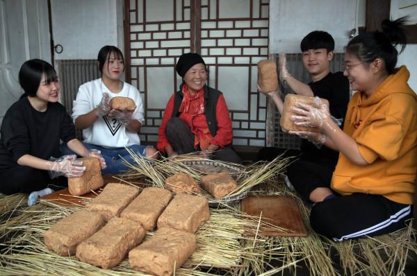 겨울을 재촉하는 비가 차분하게 내린 지난 8일 전통된장마을인 전남 강진군 군동면 신기마을 백정자씨(식품명인 제65호) 고택 마루에서 장성 하이텍고등학교 학생들이 메주 만들기 체험에 푹 빠져 있다. (사진제공=강진군청)