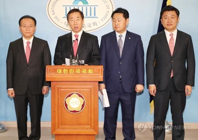 자유한국당 김성태 원내대표와 바른미래당 김관영 원내대표가 13일 오전 국회 정론관에서 환경부 장관 임명 강행 등 청와대와 여당이 협치에 노력하지 않고 있다고 지적하며 인사검증책임자인 조국 청와대 민정수석의 해임을 촉구하는 내용의 공동 기자회견을 하고 있다. 왼쪽부터 자유한국당 윤재옥 원내수석부대표, 김성태 원내대표, 바른미래당 김관영 원내대표, 유의동 원내수석부대표.