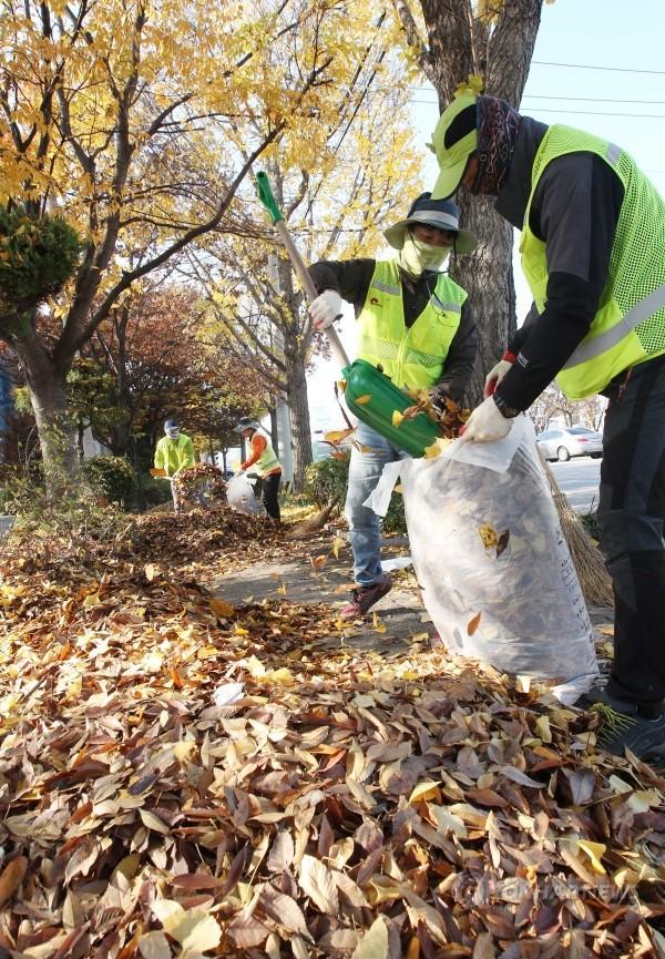 13일 오후 광주 북구 중흥동 거리에서 광주 북구청 청소행정과 직원들이 낙엽을 수거하고 있다. 북구는 수거된 낙엽을 농가나 농장에 퇴비용으로 지원해 해마다 생활 쓰레기 처리비용을 절감하는 효과를 거두고 있다.