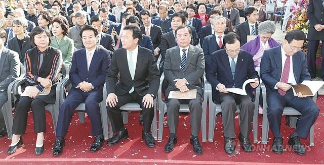 13일 오후 서울 종로구 조계사 대웅전에서 열린 대한불교조계종 제36대 총무원장 원행 스님 취임 법회에 정의당 이정미 대표(왼쪽부터), 민주평화당 정동영 대표, 바른미래당 손학규 대표, 자유한국당 김병준 비대위원장, 더불어민주당 이해찬 대표가 참석해 있다.
