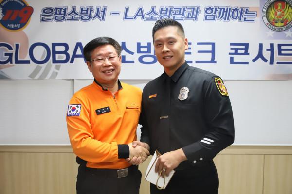 서울 은평소방서는 13일 소방서 회의실에서 ‘LA소방관과 함께하는 글로벌 토크 콘서트’를 열었다. 글로벌 토크 콘서트는 정재후 서장을 비롯한 소방공무원 50명과 미국 LA소방서에서 조사관으로 근무 중인 로렌스 김 등이 참여한 가운데 진행됐다. 사진은 정 서장 및 로렌스 김이 기념촬영을 하는 모습. (사진제공=은평소방서)