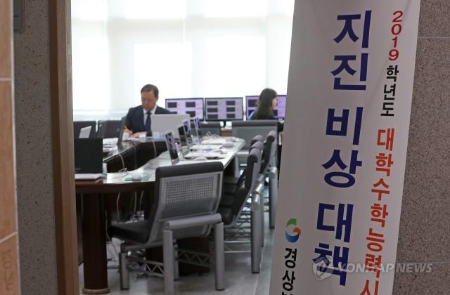 경북도교육청이 수능을 하루 앞둔 14일 경북 포항교육지원청에서 포항·경주 지구 시험장 22곳의 지진 상황을 판단하고 대처할 수 있는 비상대책 상황반을 운영하고 있다.