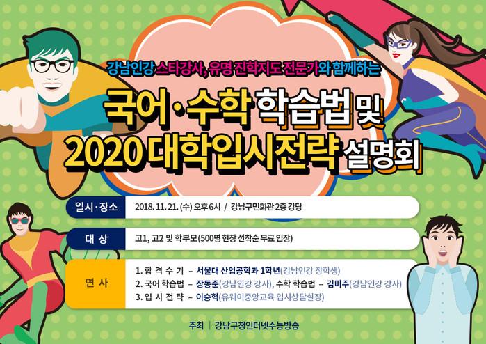 18일 구에 따르면 이번 설명회에서는 ▲이승혁 유웨이중앙교육 입시상담실장이 2020학년도 대입전형 안내, ▲강남인강 장동준·김미주 강사가 각각 국어·수학 학습전략을 제시한다. 이와함게 2018년 서울대에 합격한 강남인강 수강생도 참석해 경험담을 전한다.