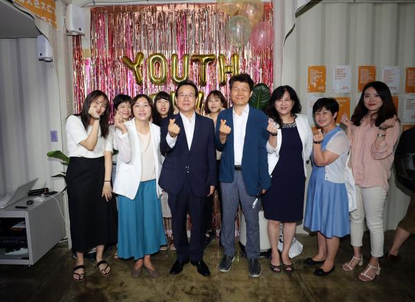정순균 서울 강남구청장이 지난 8일 강남구 개포로 개포디지털혁신파크내 무중력지대 강남에서 열린 ‘무중력지대 강남 개관식’에 참석했다. 사진은 청년들과 함께 기념촬영을 하고 있는 정 구청장의 모습.(사진제공=강남구청)